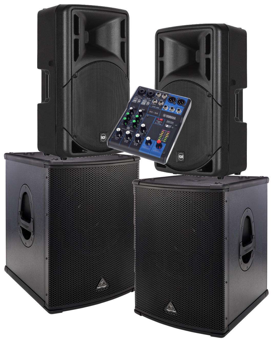 Tout est compris 2 Enceintes amplifiées RCF posées sur 2 Caissons de Basses Amplifiés, une table de mixage fourni avec un microphone à fil et 2 cordons pour connecter sur un ordinateur, PC ou Mac ou Smartphone.