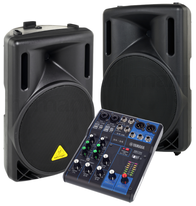 Tout est compris 2 Enceintes amplifiées posées sur pieds, une table de mixage fourni avec un microphone à fil et 2 cordons pour connecter sur un ordinateur, PC ou Mac ou Smartphone